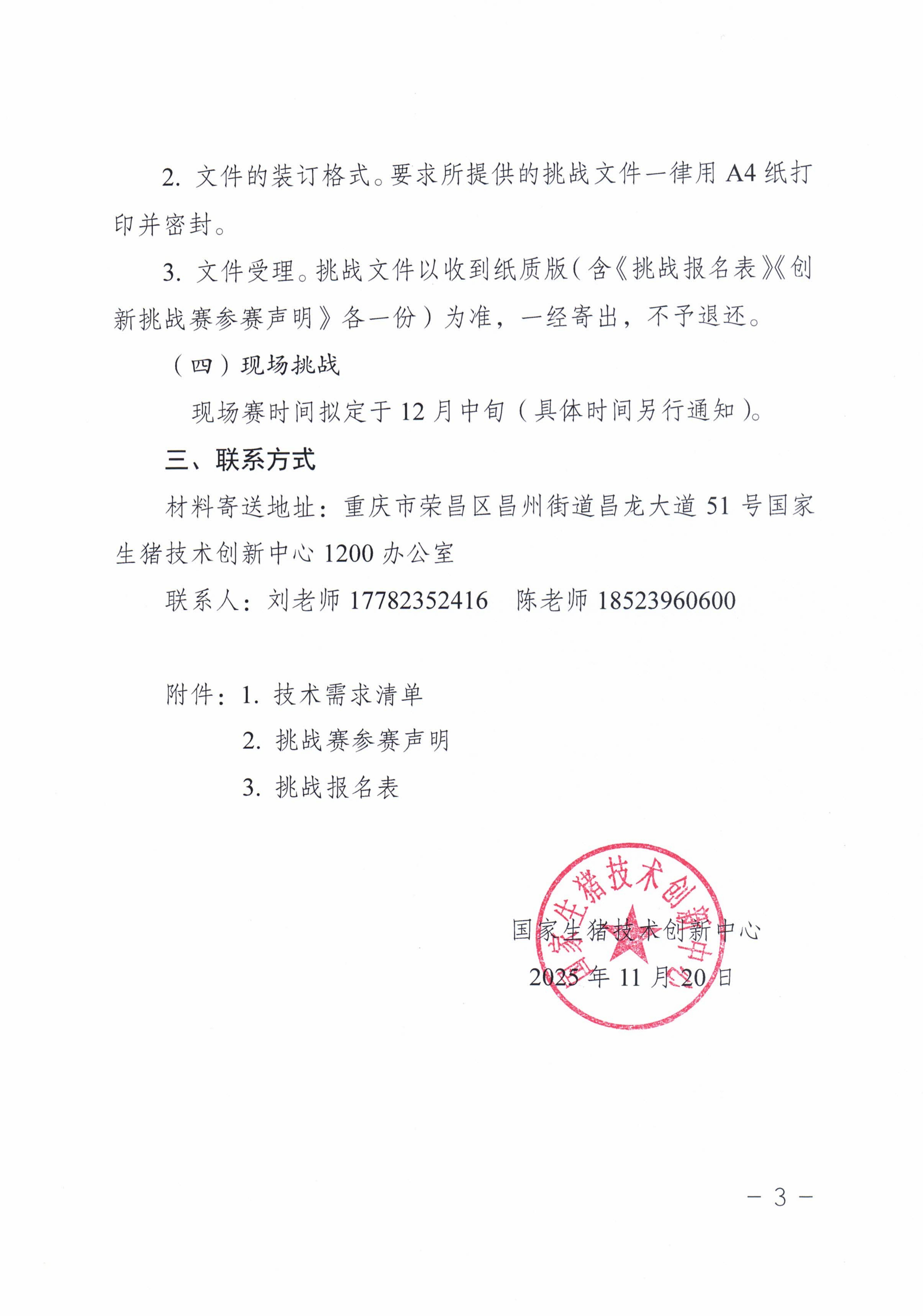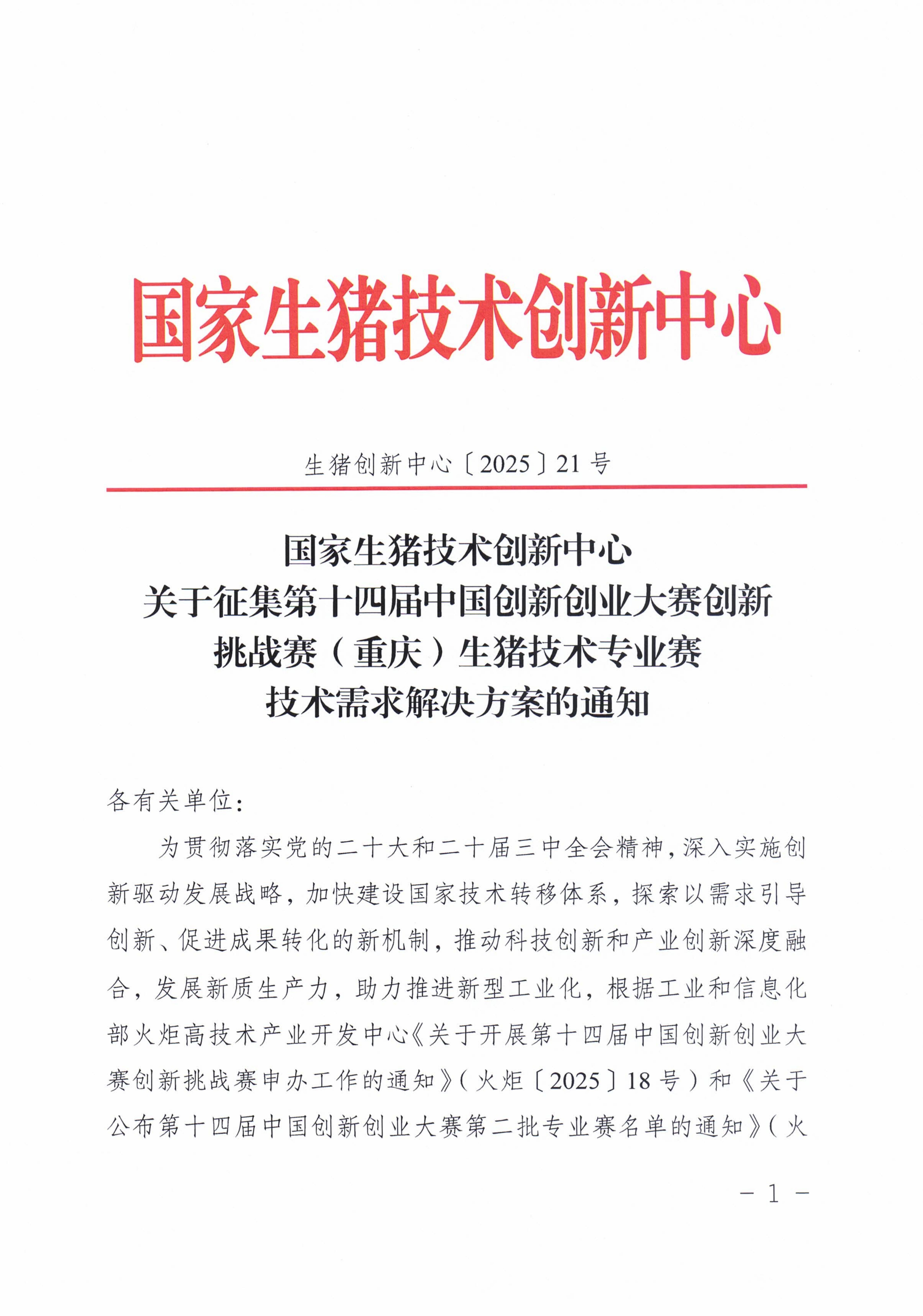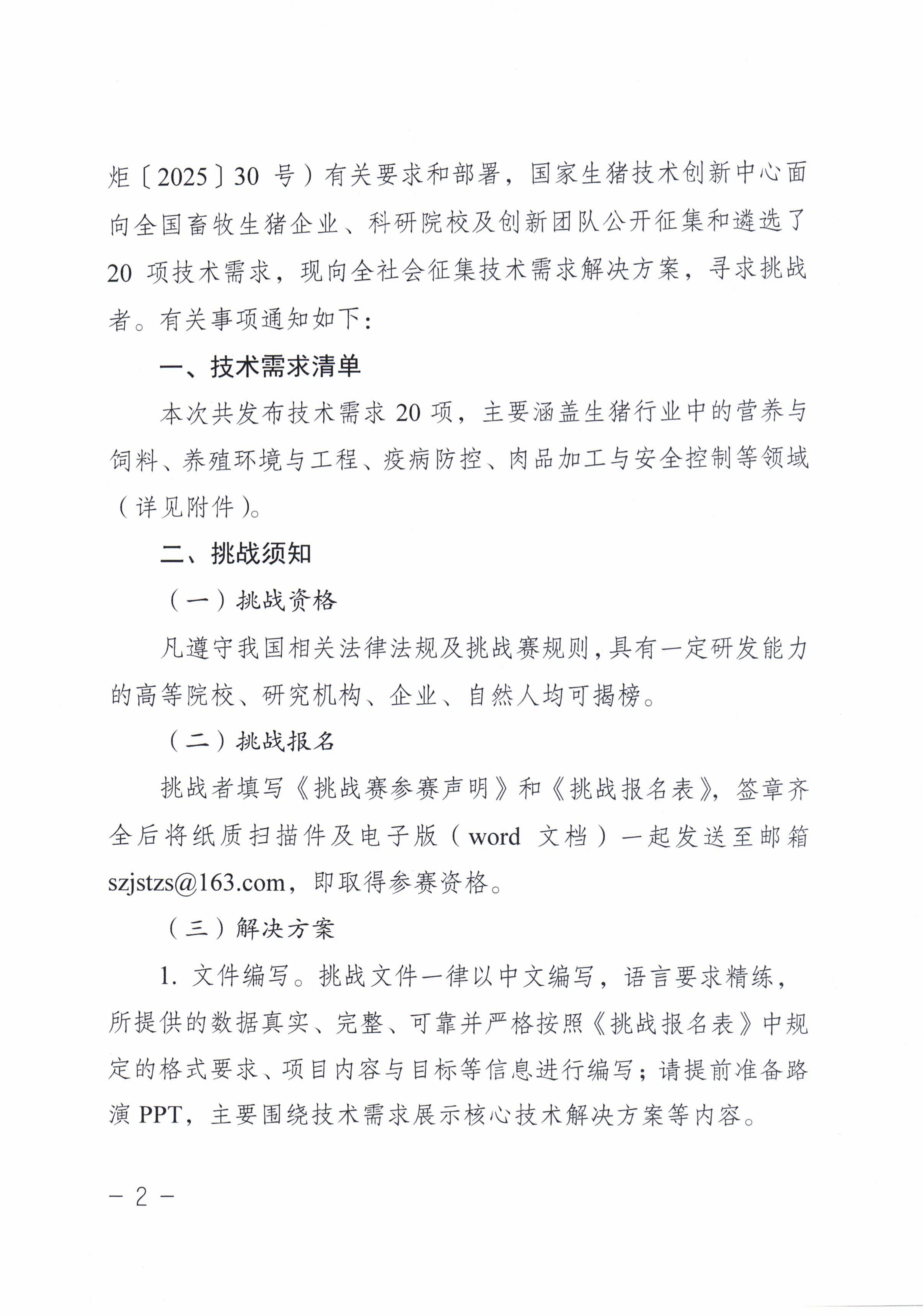 关于征集第十四届中国创新创业大赛创新挑战赛(重庆)生猪技术专业赛技术需求解决方案的通知 2025年11月21日11:24:41103阅读模式 附件1:技术需求清单 附件2:挑战赛参赛声明 附件3:挑战报名表